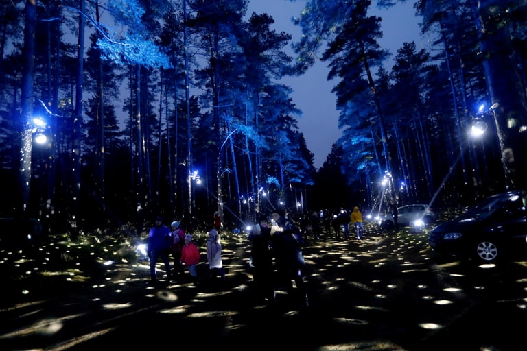 在拉脫維亞首都里加(Riga),人們走進街上一條佈滿燈光的城市森林光廊裡。