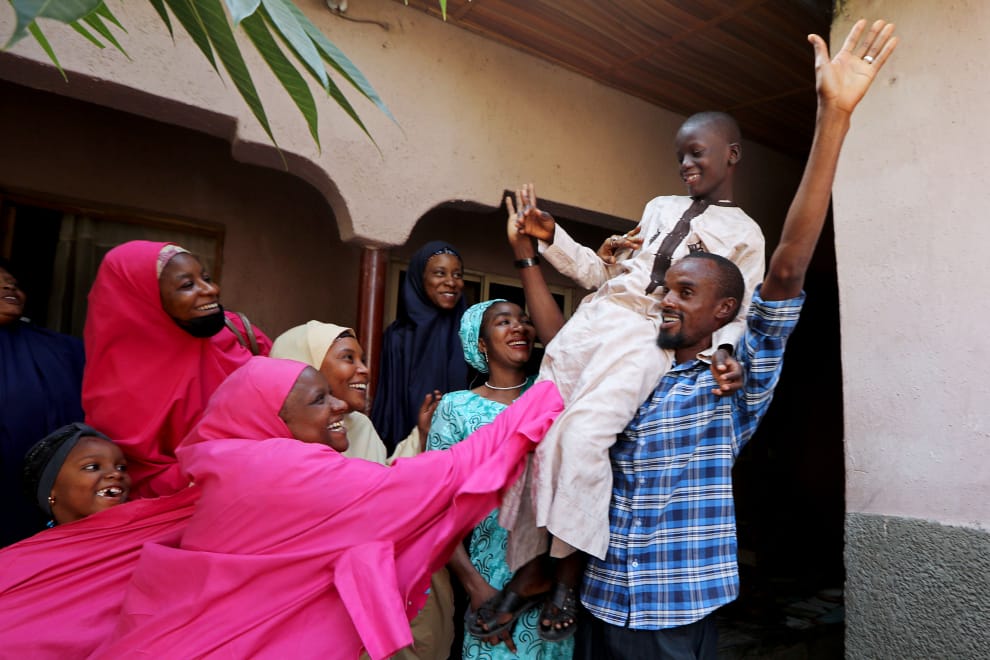 在奈及利亞北部卡齊納州(Katsina state)的坎卡拉鎮(Kankara),貝洛(Muhammed Bello,坐在男子肩上者)的親戚一看見他回到家中,開心地一擁而上。