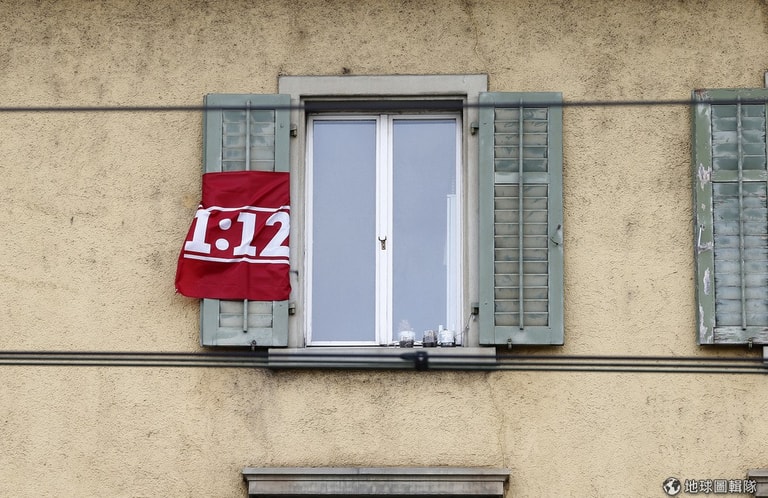 一個標著1:12的旗幟掛在蘇黎市區中的民宅窗外。瑞士當地即將在11/24號舉行投票,決定一項有關薪資的措施是否要通過。這條新措施將會限制一家公司的薪水最高數字不能超過最低薪資12倍