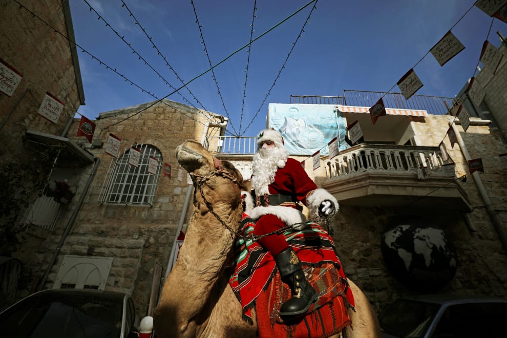 在以色列大城耶路撒冷的舊城區,聖誕老人卡西西(Issa Kassissieh)辛苦將市府提供的小聖誕樹發給市民後,騎上駱駝準備離開現場。