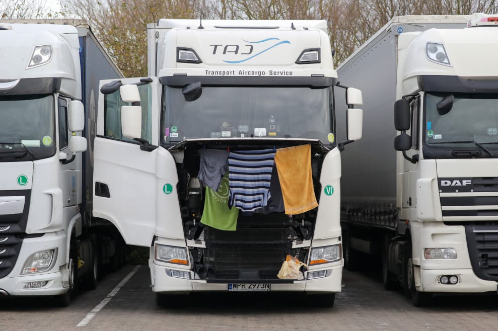 在英國東南部阿什福德市(Ashford)的國際卡車休息站,一名卡在邊境動彈不得的司機將衣服、毛巾洗乾淨,掛在卡車的引擎上晾乾。
