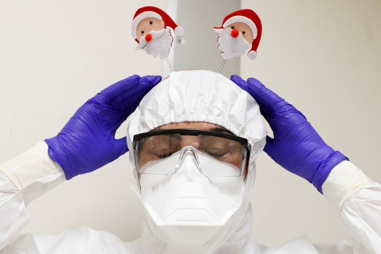 在義大利羅馬的聖菲利波內里醫院(San Filippo Neri hospital),一名醫護人員在穿上全套防護裝後發揮巧思,戴上可愛的聖誕老人頭飾。