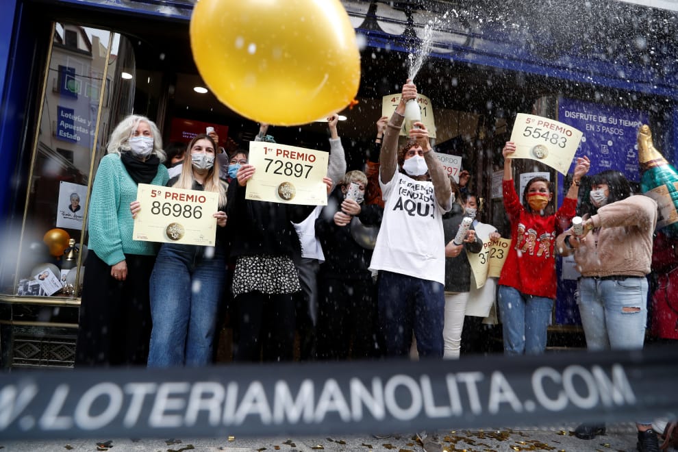 在西班牙首都馬德里,樂透攤商們聚在一塊,拿著今年聖誕樂透「胖子」(El Gordo)的中獎號碼,恭賀今年的中獎幸運兒。
