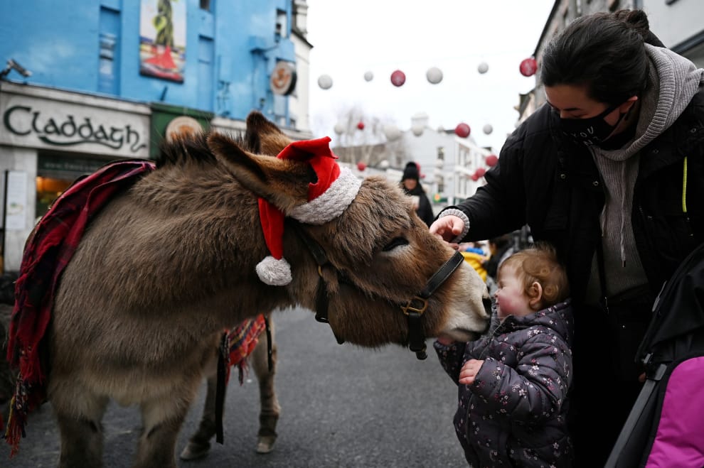 在愛爾蘭第六大城高威市(Galway)的商店街上,一隻帶著聖誕帽的驢子熱情地用鼻子摩擦兩歲孩子福克斯(Sofia Fox)的臉。