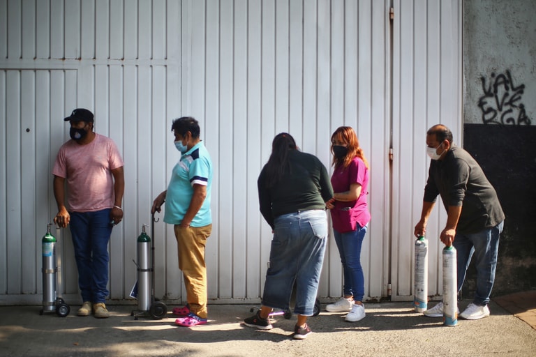 在墨西哥市一間醫療器材商店外,COVID-19(武漢肺炎)確診病患的家屬帶著氧氣瓶沿著牆壁排隊,準備重新裝填病患保持呼吸所需的氧氣。