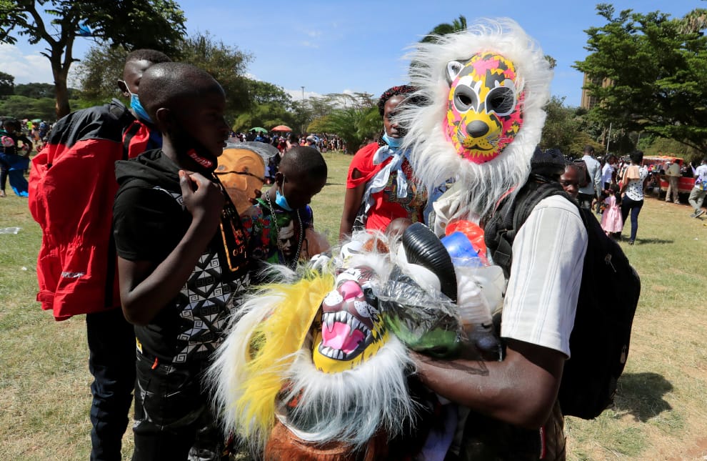 在肯亞首都奈洛比(Nairobi)市中心的烏胡魯公園(Uhuru Park),一名小販向趁著聖誕節出來公園遊玩的民眾兜售面具。