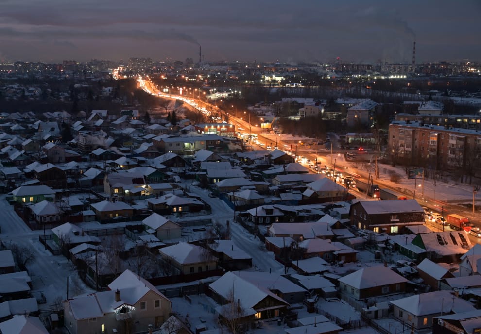 在俄國中部的鄂木斯克(Omsk),大馬路上來往的車輛、路燈等散發出的燈光,形成一條美麗的城市光帶。