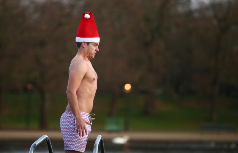 在英國首都倫敦的海德公園(Hyde Park),一名男子戴上聖誕帽,準備跳進海德公園的九曲湖(The Serpentine)中游泳。