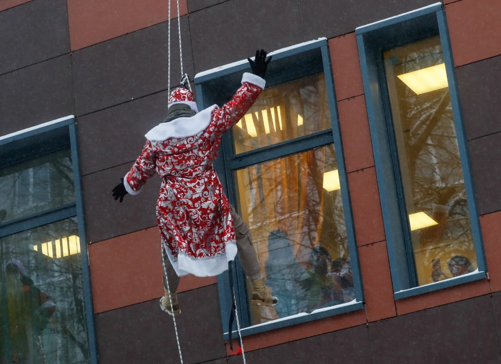 在俄國首都莫斯科,俄國救難隊的成員們打扮成俄國版聖誕老人「嚴寒老人」(Father Frost)的樣子,從一間醫院外垂降下來與院內的孩子們打招呼。