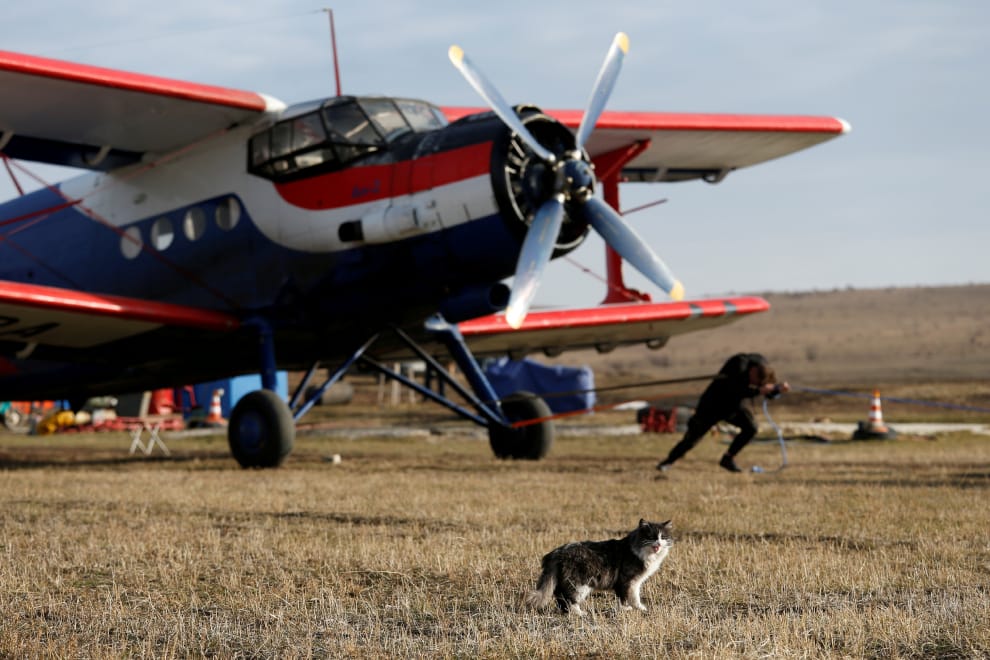 在俄國南部斯塔夫羅波爾(Stavropol)邊疆區附近的小村莊韃靼卡(Tatarka),普里霍科(Pavel Prikhodko)奮力拉動一台An-2飛機,為一場公益活動募款。正當攝影師要拍下普里霍科的身影時,一隻貓咪突然闖進鏡頭,轉移了焦點。