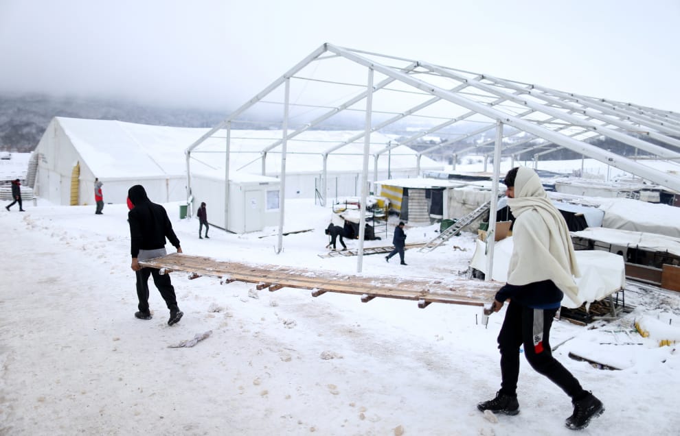 在波士尼亞與赫塞哥維納(下文簡稱波赫)西部邊境的利帕(Lipa)難民營,兩名難民合力抬起一塊準備拿來當柴燒的木板,希望隨後升起的火能讓身子暖和一些,好撐過這個寒冷的冬天。