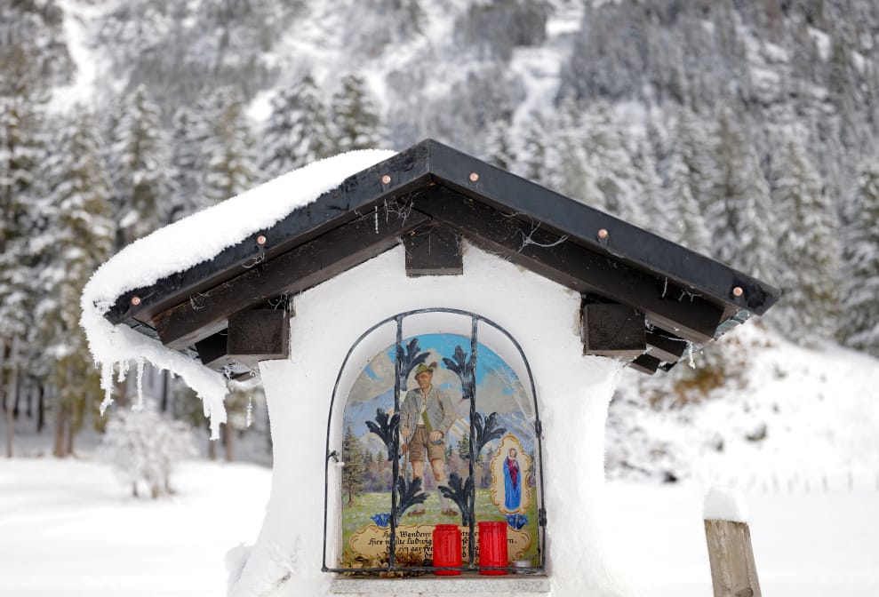 在德國巴伐利亞州的奧伯斯多夫鎮(Oberstdorf),經過連日大雪後,當地一塊小小的紀念石上也堆滿了積雪。