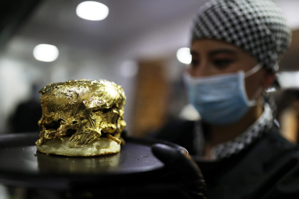 在哥倫比亞首都波哥大(Bogota)的Toro McCoy餐廳,一名廚師細細端詳包上金箔的黃金漢堡,檢視上頭是否有瑕疵。