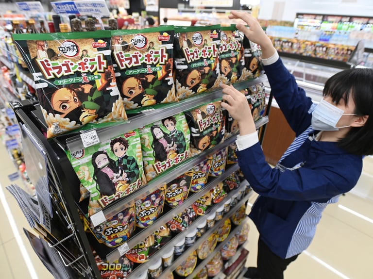 舉例來說,日本飲料製造商大德食品集團(Dydo Group Holdings Inc.)在開賣以《鬼滅之刃》角色來包裝的飲料後,賣出了超過 5,000萬罐飲料,今年十月的銷量和去年同期相比多了 50%;日本玩具製造商SK Japan Co.則在取得《鬼滅之刃》角色的授權後,股價翻了將近一倍;日本便利商店Lawson在十月開賣 50種《鬼滅之刃》角色飯糰後,頭十天就賣出了超過 1,000萬顆飯糰,在十一月中時營業額達到了 50億日圓(折台幣約 13.7億元)。