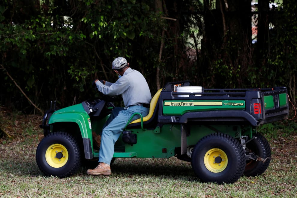 在美國佛羅里達州的西棕櫚灘(West Palm Beach),川普國際高爾夫俱樂部(Trump International Golf Club)的員工停下機具,試著從圍籬的中間一窺美國總統川普(Donald Trump)打高爾夫的身影。