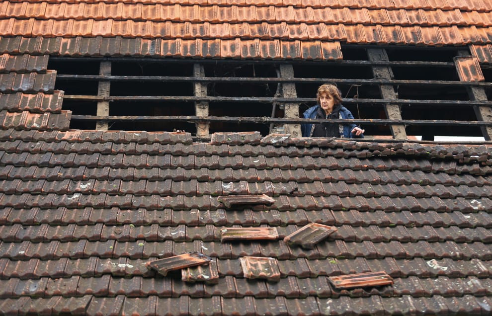 在克羅埃西亞中部的波普斯基村(Brest Pokupski),這裡在 28號當天發生地震規模 5.2的地震,一名女子從被地震震壞的屋頂探出頭來,查看屋頂的損壞情形。