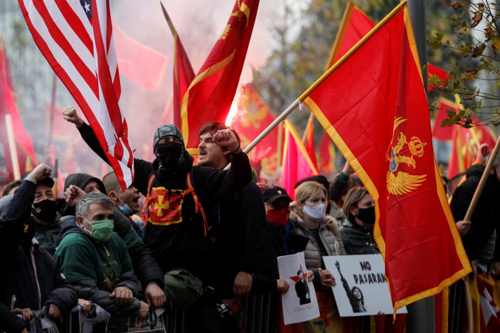 在蒙特內哥羅首都波德戈里察(Podgorica)的國會大廈前,民眾高舉國旗抗議。