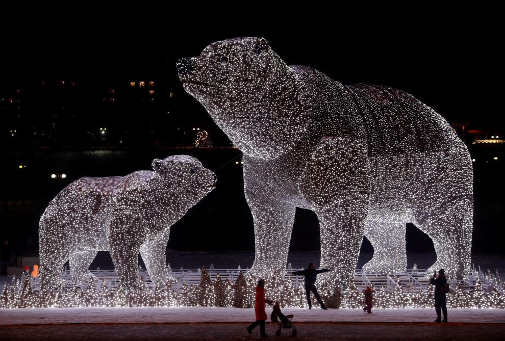 在俄國首都莫斯科的一處公園內,俄國政府設計了一組北極熊的花燈,與民眾一同慶祝聖誕節、迎接新年的到來。
