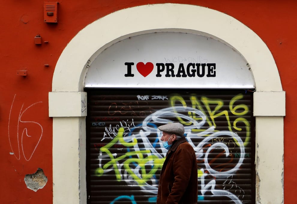 在捷克首都布拉格,一名戴著口罩的男子經過一間店門口寫著「我愛布拉格」(I ❤️ Prague)的紀念品店。