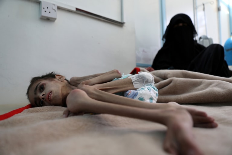 在葉門首都沙那(Sanaa),今年 7歲罹患腦性麻痺且嚴重營養不良的薩米姆(Faid Samim),虛弱地躺在醫院的病房內,等著接受進一步的治療。