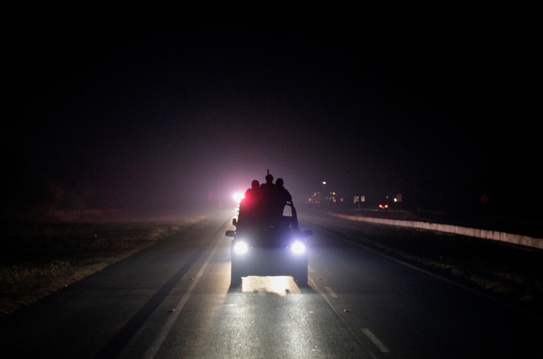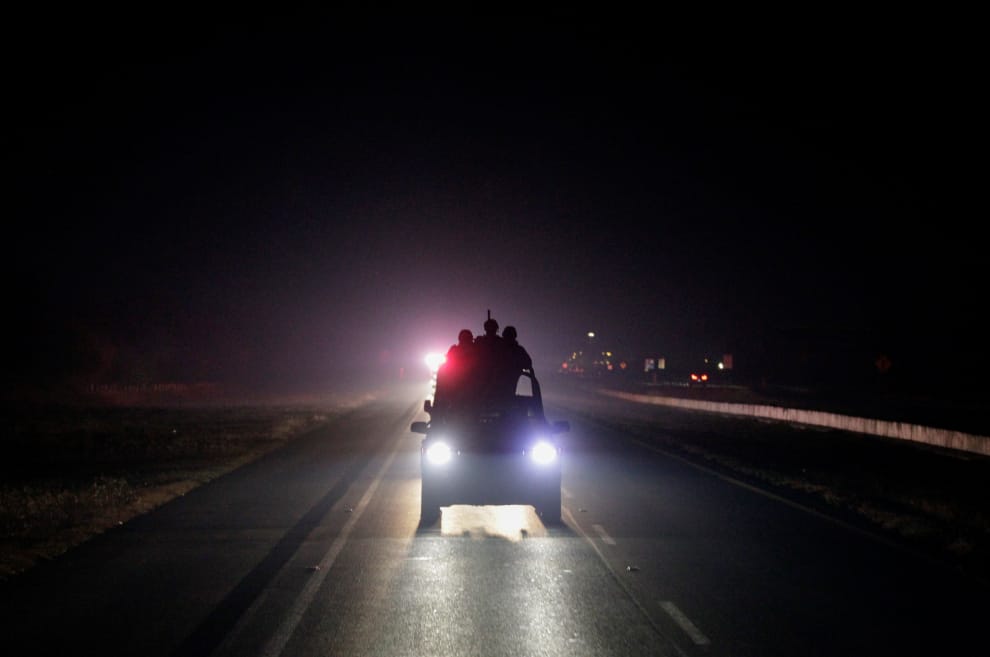 在墨西哥北部的聖卡塔林納市(Santa Catarina),墨西哥士兵駕著一輛軍用汽車,為一台滿載輝瑞COVID-19(武漢肺炎)疫苗的廂型車開路,護送它往附近的薩爾蒂約市(Saltillo)前進。