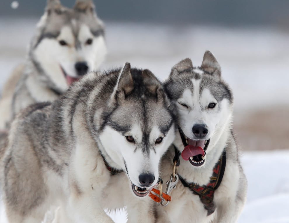 在英國中部的切爾福德鎮(Chelford),一隊哈士奇犬正在接受拉雪橇訓練,但其中的兩隻哈士奇跑著跑著,意外撞在一塊。