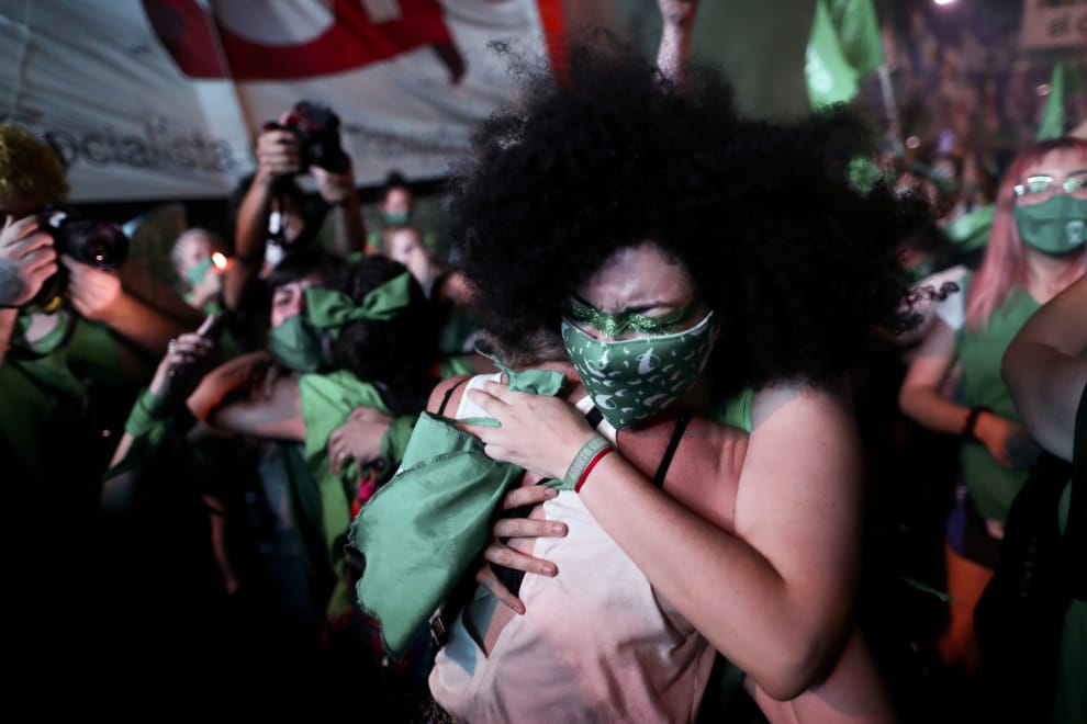 在阿根廷首都布宜諾斯艾利斯街頭,支持墮胎合法化的民眾在聽到阿根廷參議員以 38票同意、29票反對的結果,通過墮胎合法化法案後,激動地相擁而泣。