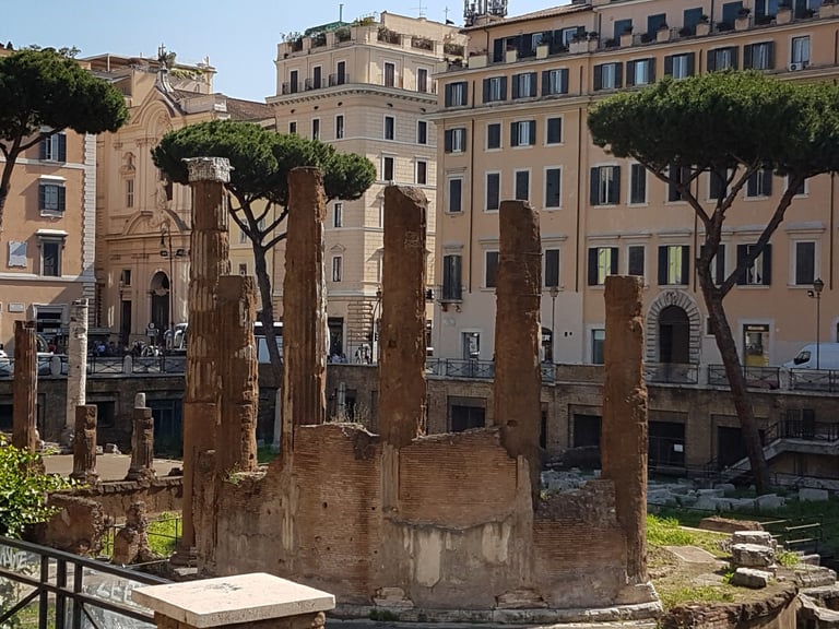 銀塔廣場有四座古羅馬共和國時期的神廟遺跡,這裡最為人熟知的典故,是作為凱撒大帝在西元前44年被暗殺的場景。不過現場絲毫沒有陰森血腥的感覺,1929年遺跡被挖掘出土後,逐漸變成流浪貓聚集之處,許多愛貓人士自發性來餵食貓群,讓貓群數量愈來愈多。
