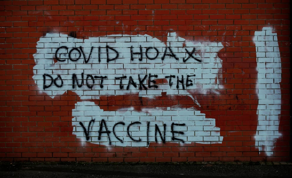 在英國北愛爾蘭首府貝爾法斯特(Belfast),一間商店的外牆被噴上警告民眾切勿施打疫苗的塗鴉。塗鴉上寫著:「COVID-19(武漢肺炎)是場惡作劇,別接種疫苗。」
