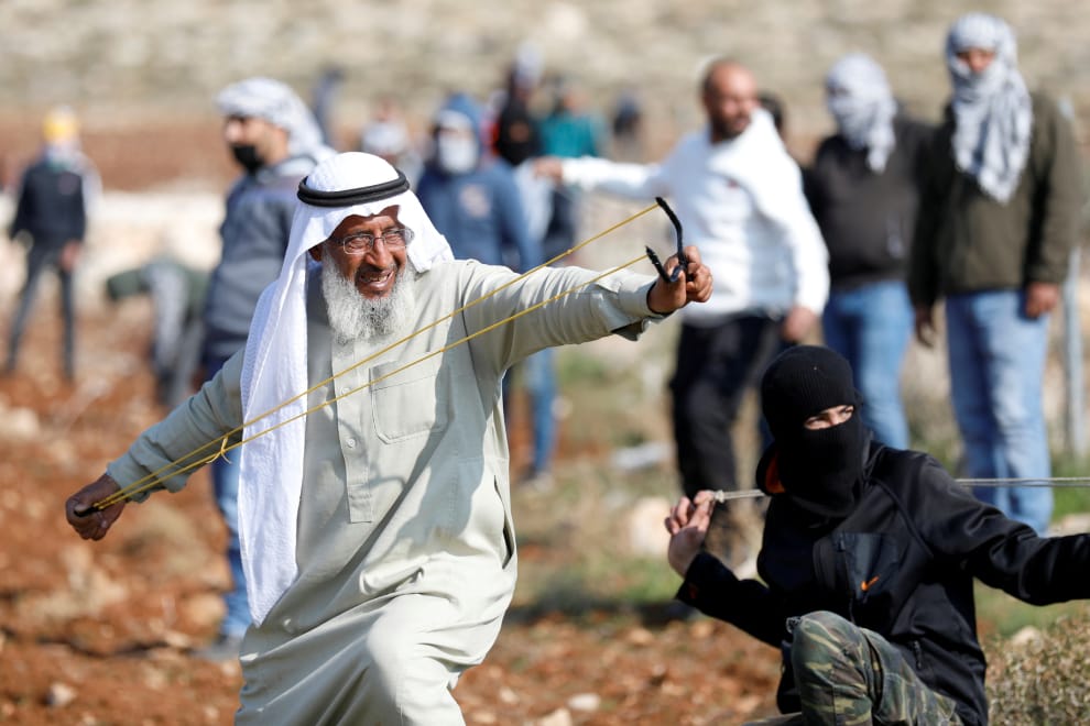 在巴勒斯坦賈里爾鎮(Deir Jarir),一場抗議以色列政府非法佔地的示威中,一名示威者單膝跪地,用彈弓朝著以色列士兵發射石子。