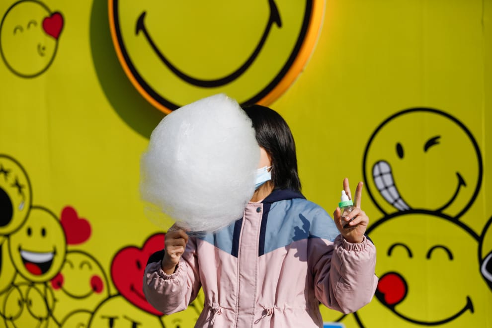 在中國河北省武漢市的歡樂谷遊樂公園,一名小女孩開心地吃著棉花糖。