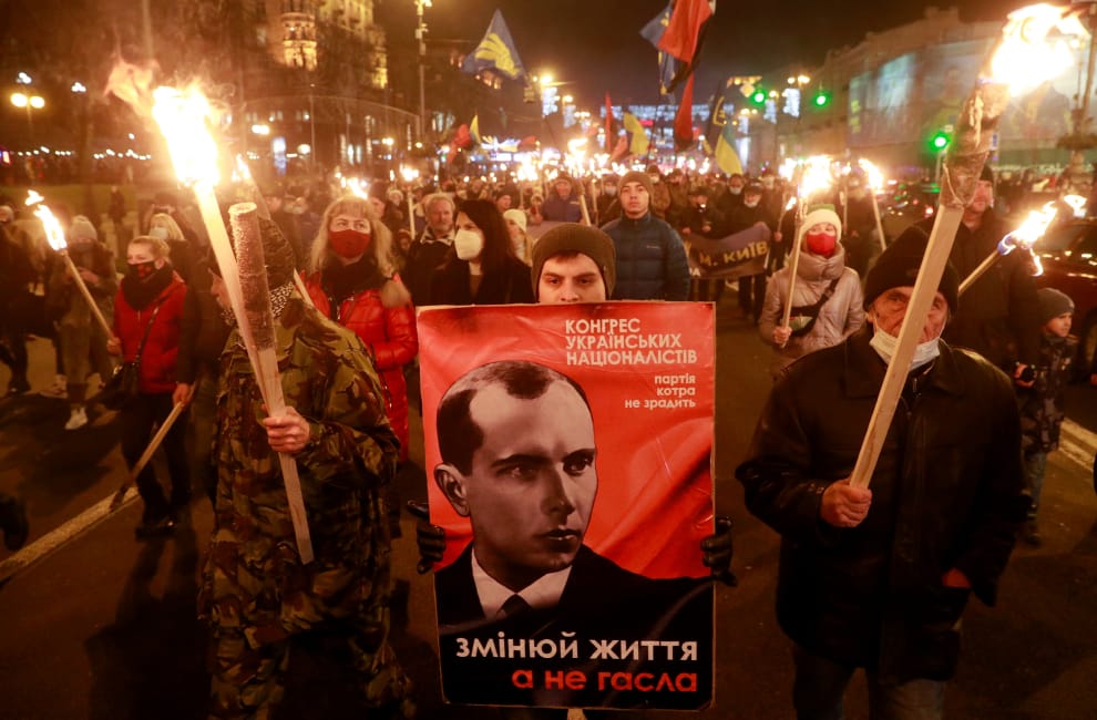 在愛爾蘭首都基輔(Kyiv),烏克蘭民族主義組織(Organization of Ukrainian Nationalists)成員拿著火把和印著烏克蘭政治家班德拉(Stepan Bandera)肖像的布條,慶祝班德拉 112歲冥誕。