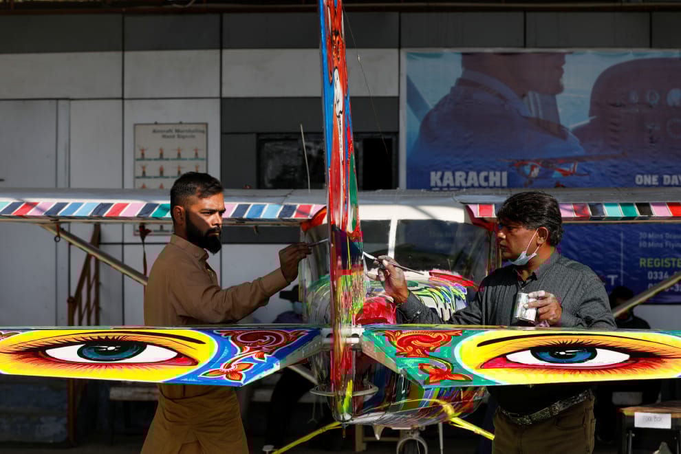 在巴基斯坦大城喀拉蚩(Karachi)的真納國際機場(Jinnah International Airport),40歲的巴基斯坦畫家阿里(Haider Ali,右)和他的學生正在彩繪一架雙座西斯納(Cessna)小飛機。