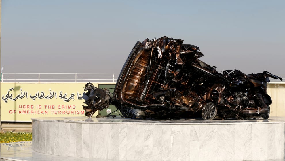 事發後,伊拉克把當時在攻擊中被炸成廢鐵的汽車殘骸留下來。如今這場暗殺屆滿一周年,不少示威者仍走上街頭,悼念蘇萊曼尼少將的死。