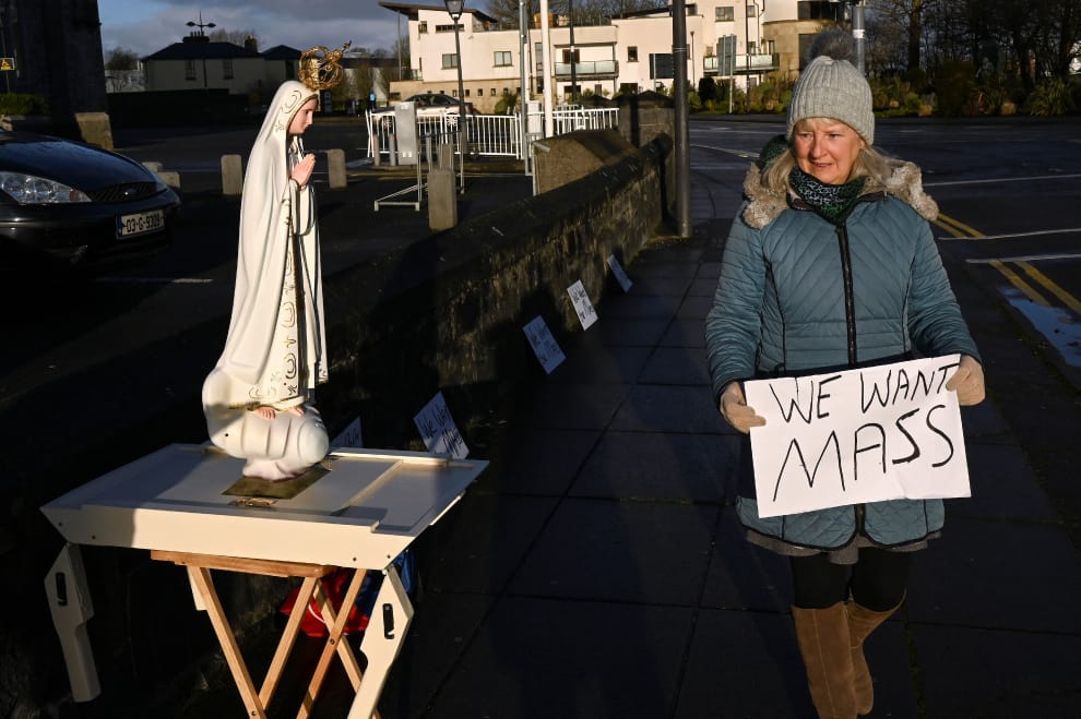 在愛爾蘭緊鄰大西洋畔的高威市(Galway),一名天主教徒帶著「讓我們舉辦彌撒」的標語,上街要求愛爾蘭政府取消COVID-19(武漢肺炎)防疫措施,讓天主教徒們能重新舉辦彌撒。