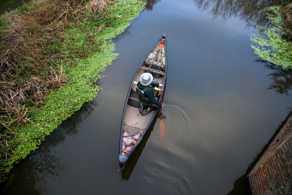 一名男子划著船槳漫遊在魏河上,享受來自大自然的綠意與寂靜。