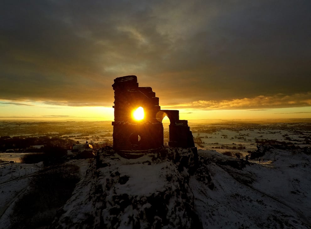 來到位於英國西北部村莊的莫科普城堡(Mow Cop Castle),冉冉升起的太陽恰好以一抹金黃填滿了城牆的空隙。