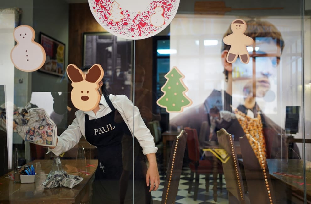 在一間位於曼谷百貨公司的餐廳裡,一名員工忙著閉店前的最後清理。當時泰國當局基於COVID-19(武漢肺炎)防疫考量,臨時勒令多處公共場所暫停營業,希望能藉此避免大規模群聚。