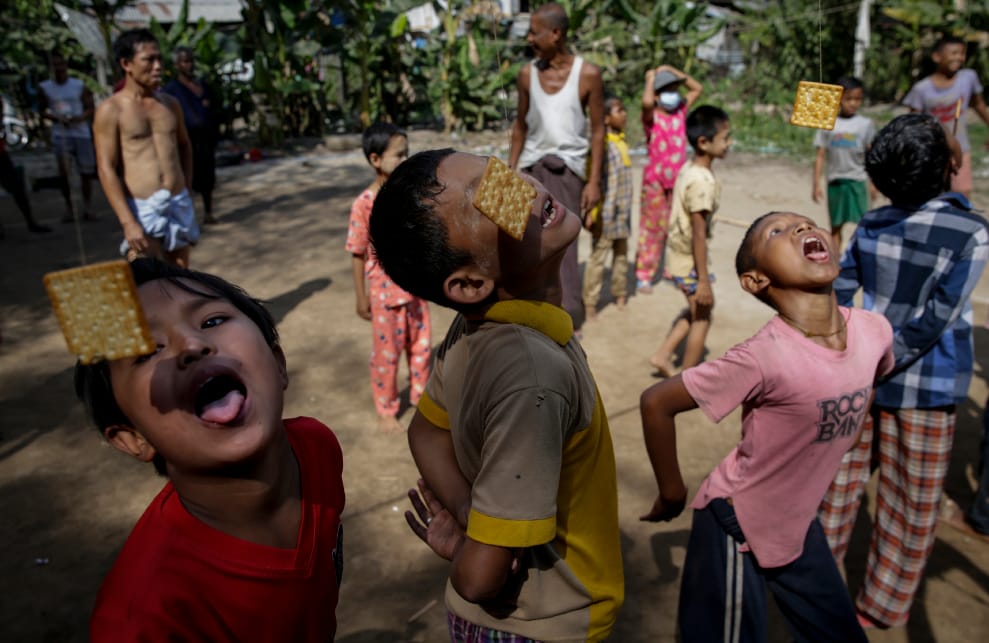幾個小孩把雙手放在背後,試著可以只靠嘴巴就把眼前的餅乾一口吃掉。這裡正在慶祝緬甸脫離英國殖民、宣布獨立 73周年。
