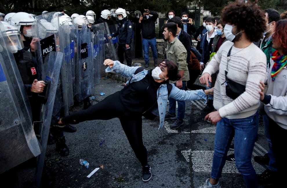海峽大學的學生走上街頭抗議,不滿土耳其總統埃爾多安(Recep Tayyip Erdogan)日前指派了親政府人士擔任他們的校長,畫面中只見一名女子奮力朝鎮暴警察的盾牌踢了過去。