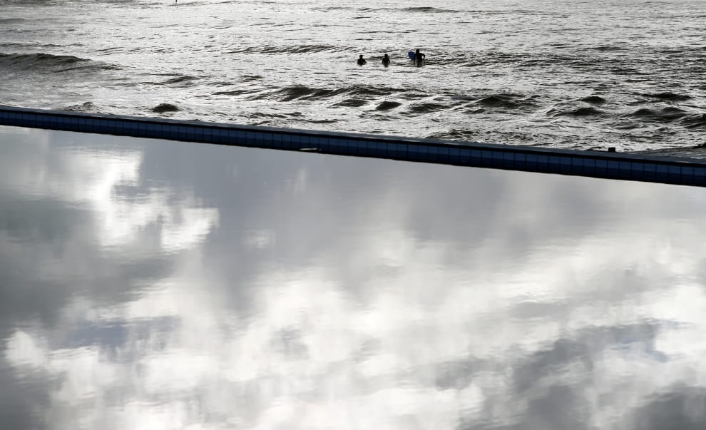 從一座臨海度假村的游泳池望去,可以看到一群趁著天色轉晴,跑到第勒尼安海(Tyrrhenian Sea)玩耍的人們,這一帶日前受到連日暴雨影響,許多臨海建物都出現程度不等的損壞。
