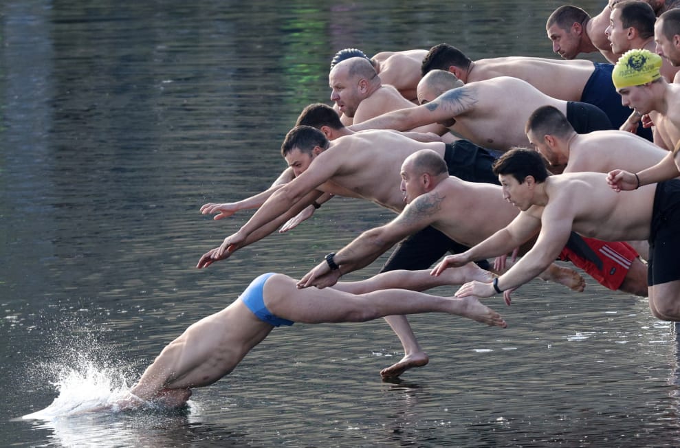 在主顯節(Epiphany)的慶祝活動上,不畏寒冷的「泳」士們爭先恐後跳入湖中,搶著要奪下鏡頭另一端的木製十字架。