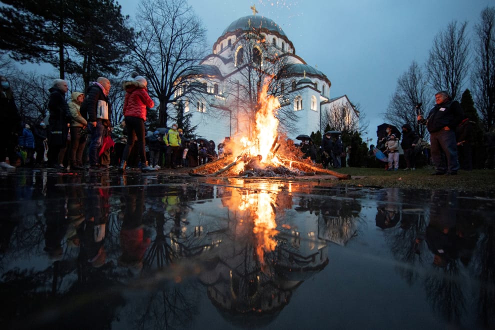 適逢東正教聖誕節,塞爾維亞的東正教信徒把象徵「尤爾木」(Yule log)的橡木丟入火中祈福,希望接下來的日子也能順順利利。