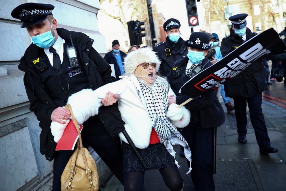 在西敏區治安法庭(Westminster Magistrates Court)外,《維基解密》(WikiLeaks)創辦人阿桑奇(Julian Assange)的支持者被警察架離現場。