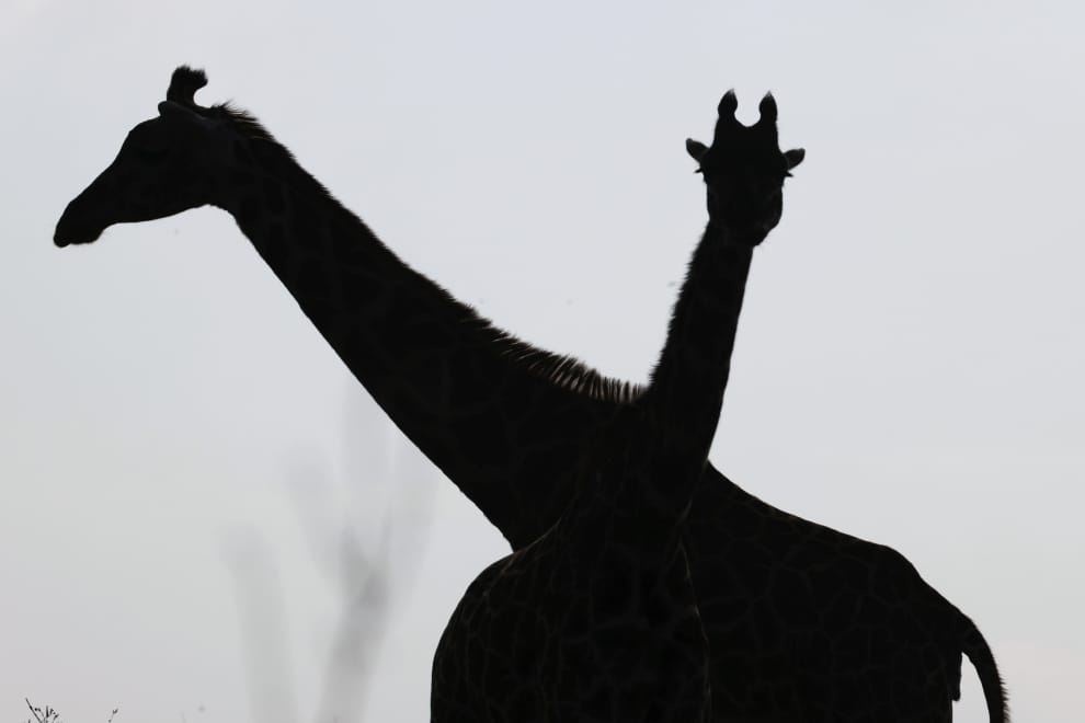 在奈洛比國家公園,兩隻長頸鹿愜意地在這裡過著牠們的日常生活。