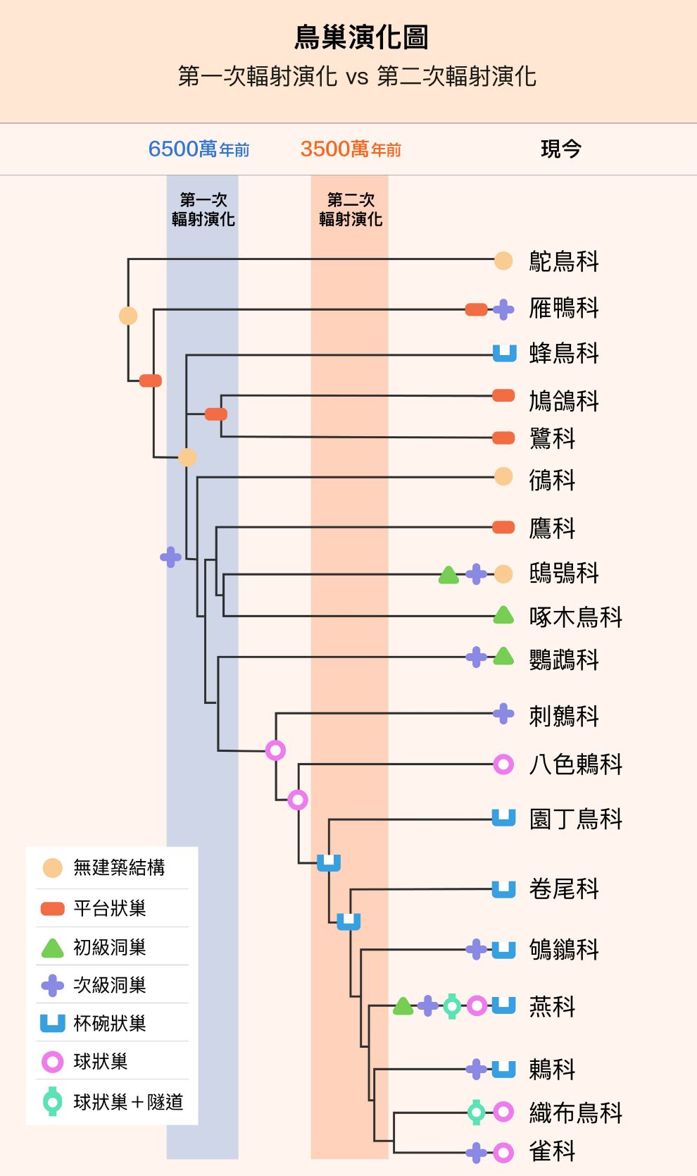 以鳥巢的外型結構來看,巢型的大量變化與第一次輻射適應的時間點相符:巢型原本只有無結構巢,大約在第一次輻射適應時,出現了平臺狀巢、杯碗狀巢和洞巢等不同結構的巢型。