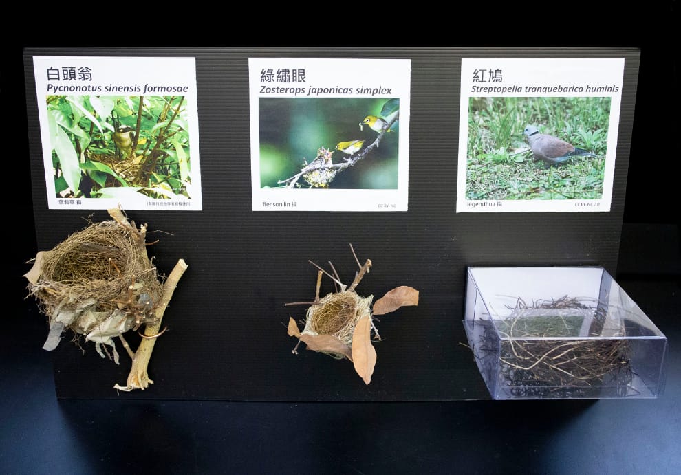圖中白頭翁和紅鳩的鳥巢為底部支撐、綠繡眼的鳥巢為水平分叉固定。鳥巢的附著方式,主要分成底部支撐、水平分叉固定、側掛和垂吊四種,以底部支撐最常見。