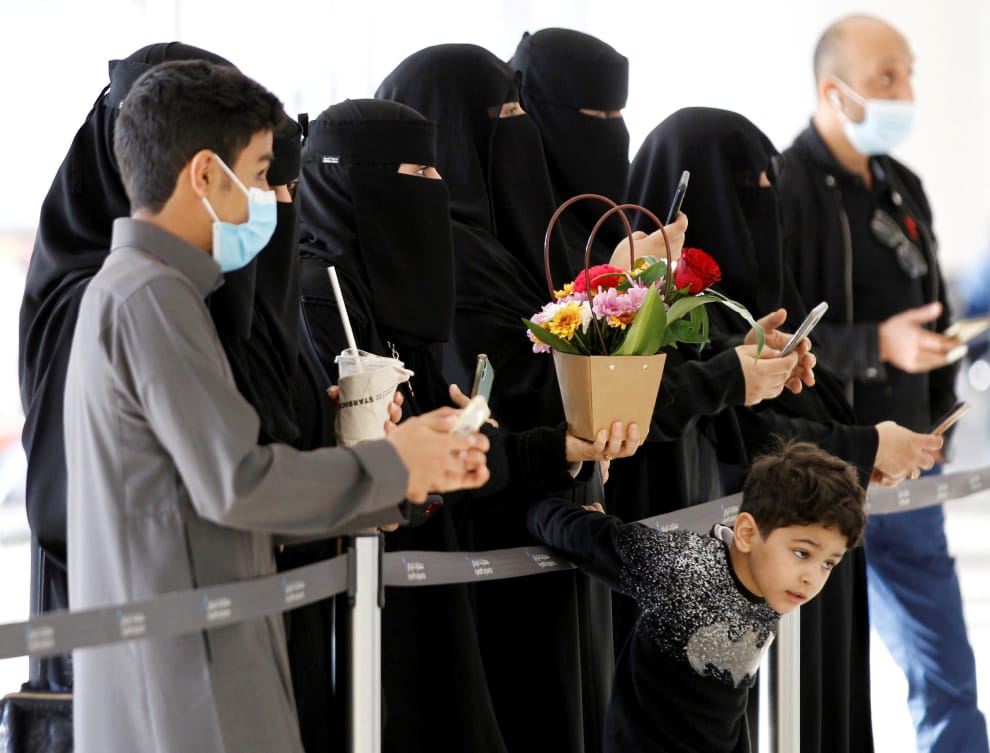 在哈立德國王國際機場(King Khalid International Airport),人們在封鎖現外殷切等待剛回國的親戚。
