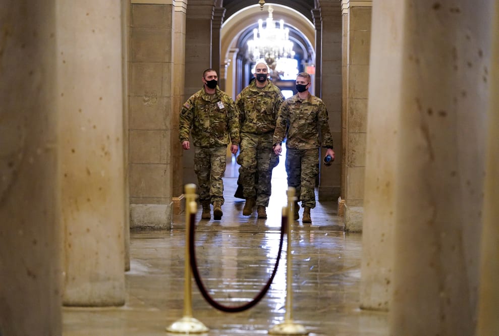 美國國民衛隊走在國會大廈的廳堂。在發生國會被闖入事件後,各界無不繃緊神經,加緊維安等待本月 20號的美國新任正副總統就職典禮來臨。