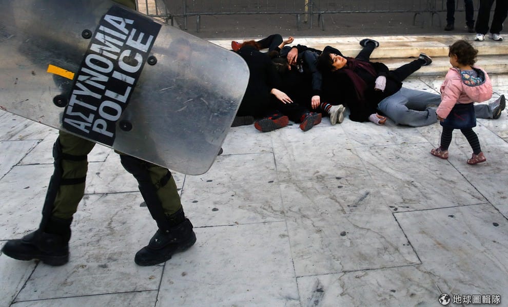 示威者躺在議會的大門前,一旁有警員走過。數千名雅典中部的民眾抗議政府的撙節政策,他們示威活動的這天,也是學生起義反對軍事政權滿40周年的日子